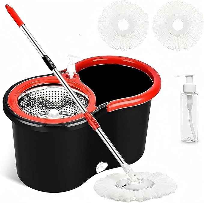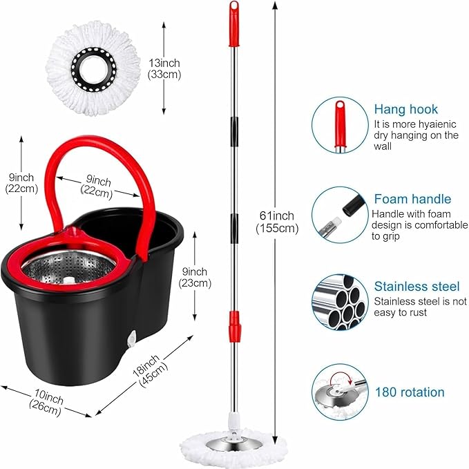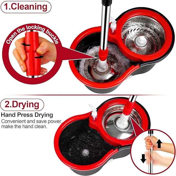 This spin mop bucket refills for floor cleaning are gentle on all types of floors, making it safe to use on your delicate surfaces. With its deep-cleaning & streak-free features, it effectively attracts & locks in dirt, dust, pet hair, grime, dried-on, or sticky messes better than traditional cotton wet mops. It can rotates and washed dehydrated by simply pushing it up and down with a professional bucket. It can be cleaned while standing, which is very convenient for people with back pain and elderly people. When cleaning, do not exceed the high water mark. It has a draining function, and compared to an ordinary squeeze mop, you can drain water without bending your hips when you step on or turn your hands.